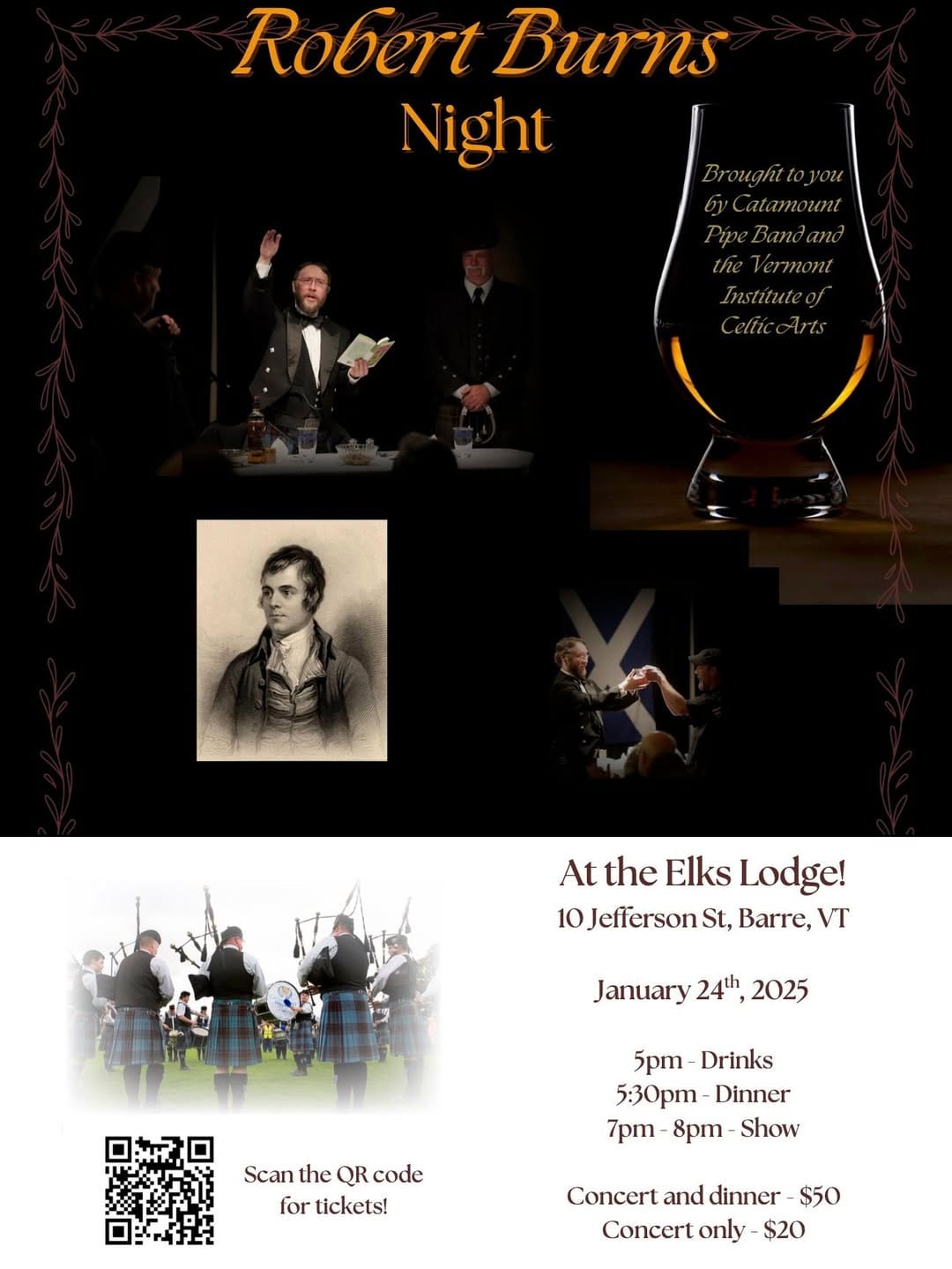 Robert Burns Night! Brought to you by Catamount Pipe Band and the Vermont Institute of Celtic Arts. Also featuring Vermont Highland Dance. At the Elks Lodge 10 Jefferson St, Barre, VT. Jan 24th 5pm Drinks, 5:30pm Dinner, 7pm Concert. Concert and Dinner $50, Concert only $20. Scan the QR code for tickets, or find them...